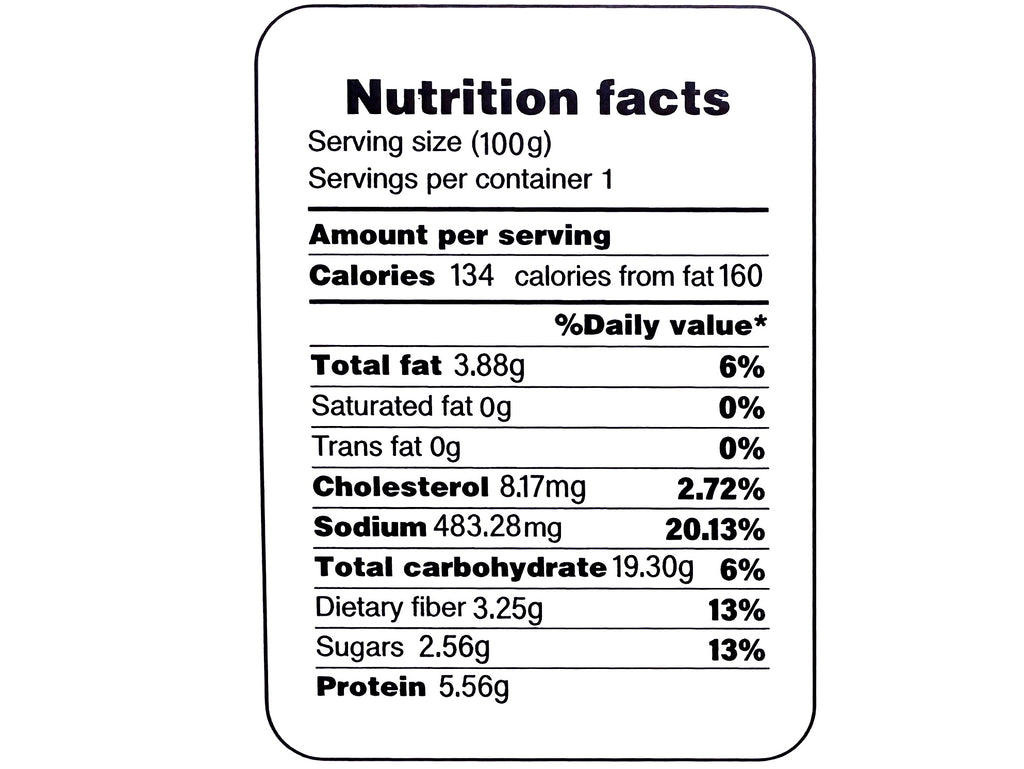 Ingredients: Grape leaves, rice, split peas, tomato paste, fresh aromatic herbs, vegetable oil, salt, turmeric, pepper, soya, sugar, lemon juice, water.