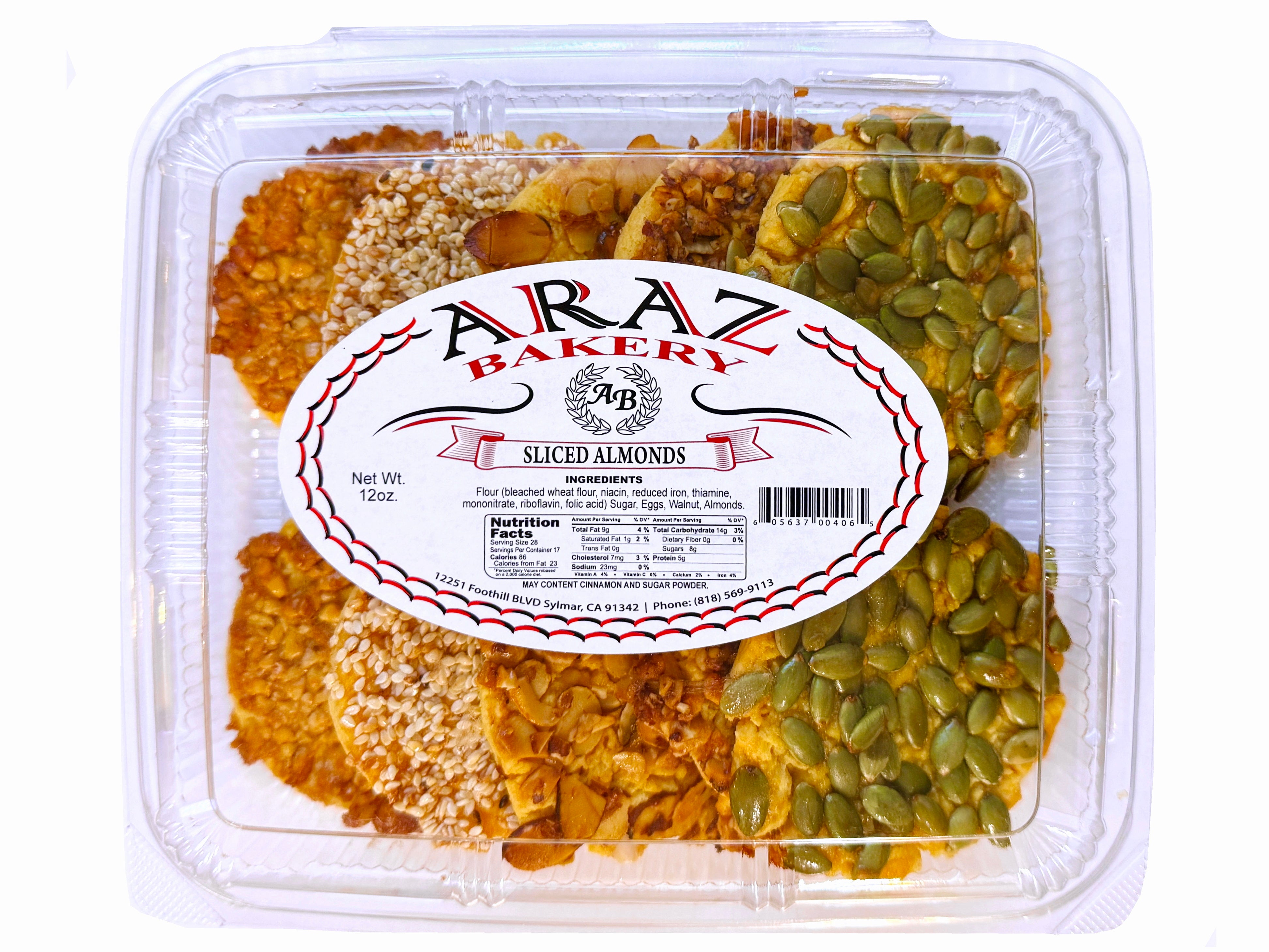 Ingredients: Flour(bleached Wheat flour, Niacin, reduced Iron, Thiamine, mononitrate, Riboflavin, Folic acid), Sugar, Eggs, Walnut, Almonds